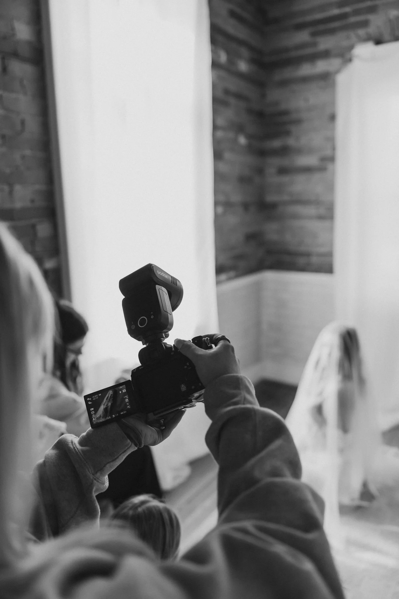 Corner of a photography studio in Tremont, Illinois, with exposed brick wall, white wood paneling, a beige sofa with a checkered beige blanket, a green armchair with a plaid pillow, white curtains, and a white rug on wooden floor.